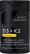 Sports Research D3 + K2 delivers a solid 5,000 IU dose of vitamin D3, matching our top-rated supplement, but falls short in a few key areas that landed it at #2 on our list. The softgel format, while convenient, typically offers lower bioavailability compared to liquid formulations. Additionally, it provides only 100 mcg of vitamin K2—half the amount found in our #1 pick. What sets this supplement apart is its commitment to plant-based sourcing: the D3 is derived from lichen rather than traditional animal sources, while the K2 comes from chickpeas. This makes it an excellent choice for vegans and those preferring plant-derived nutrients, though the trade-offs in absorption and K2 content keep it from claiming the top spot.